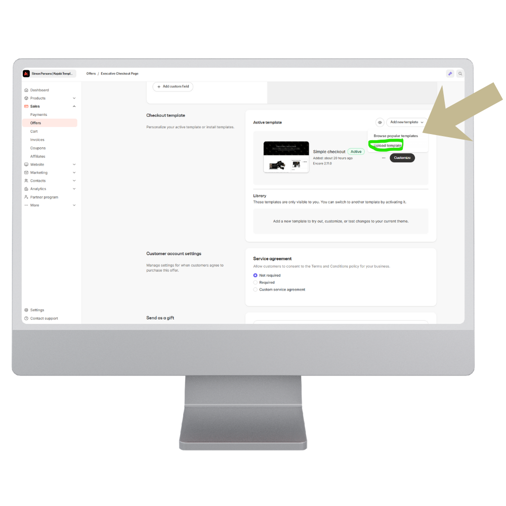 Open Kajabi → go to the Offer you want to customize → select Customize → Upload Template.